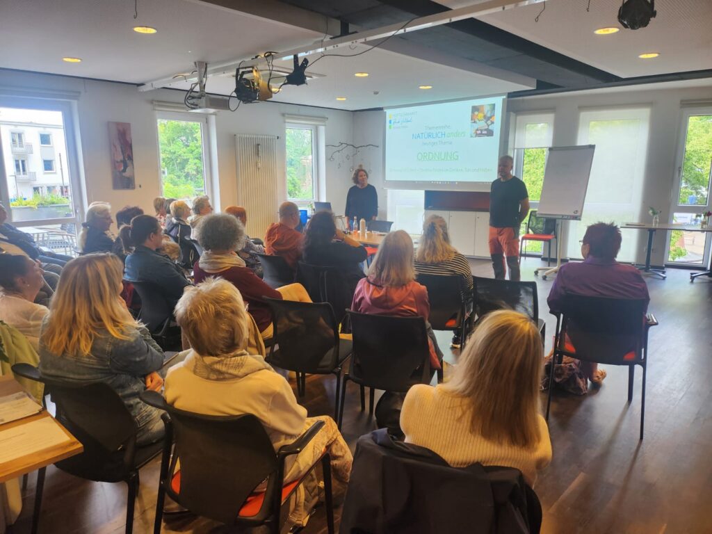 Kaum ein Stuhl blieb frei im Bistro des Haus der Begegnung. Der Vortrag zum Thema ein geordnetes, nachhaltiges Leben traf einen Nerv und zahlreiche Teilnehmer fanden sich ein, um von den beiden Ordnungscoaches Dirk Brueckner und Kerstin Tiessen von Team Ordnung Hinweise und Tipps zu erhalten. Beide erläuterten mit praktischen Beispielen wie bewusste Ordnung hilft nachhaltiger zu leben, Ballast loszuwerden und achtsamer mit Besitz umzugehen. Sie machten deutlich: Ordnung im Leben fördert immer auch Klarheit und Struktur im Alltag. Unordnung kostet nervige Zeit, Geld und Lebensenergie. Im Anschluss an den Vortrag folgte eine rege Diskussion und der Infotisch vor Ort mit Büchern zum Thema aus der Stadtbücherei wurde eifrig genutzt.
